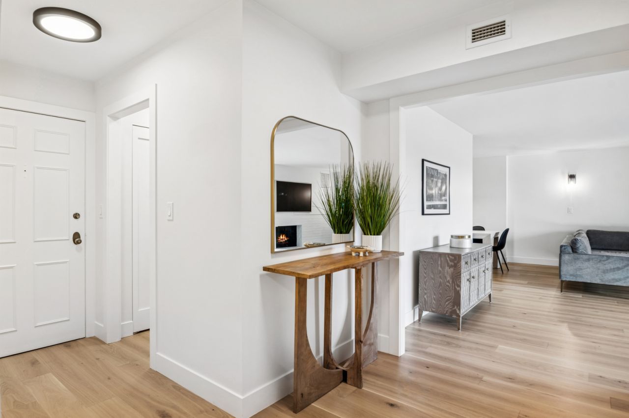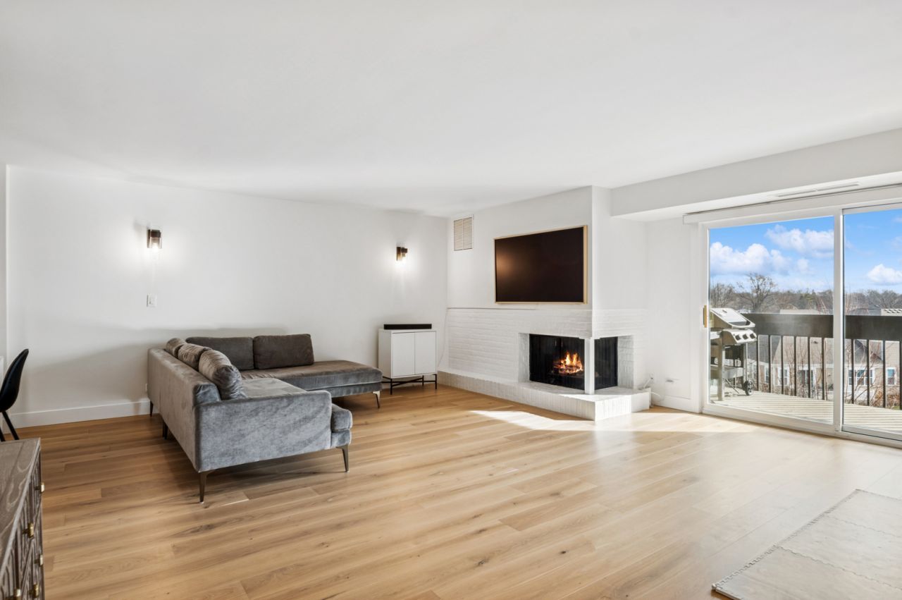Perfect, newly-remodeled fourth-floor unit with southeast pond views in the premiere Mission Hills community! Rarely available move-in ready retreat on a high floor and with the best views. This is an expansive 2 bedroom, 2 bathroom condo where everything has been upgraded to a high level and with exceptional attention to detail- new 7 wide plank white oak flooring, stunning chef's kitchen featuring Quartz counters and lots of custom cabinet space, modern designer bathrooms with spa-like finishes, a primary en-suite wing with large custom walk-in closets, wide relaxing balcony with views, and an in-unit laundry. This is a true oasis with a corner brick-clad gas fireplace, and views from the living room and bedrooms of the serene pond and sunrise. Convenient heated garage parking space, elevator access, and a storage room. Enjoy all that Mission Hills has to offer- 24-hour gated security, outdoor pools, tennis courts, walking paths, and more.